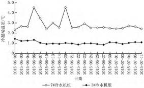 廣場空調(diào)機房擁有12臺某品牌集中空調(diào)冷水機組,其中3#離心式冷水機組制冷量為2110kW,輸入功率為400kW,安裝了冷水機組同品牌端蓋式膠球清洗裝置,其控制系統(tǒng)與冷水機組互聯(lián)互通,根據(jù)冷凝端溫差控制膠球清洗使得二者在其佳效率點附近運行。7#離心式冷水機組制冷量為4218kW,輸入功率為738kW,2臺冷水機組共用冷卻水源,冷凝器換熱管均進(jìn)行了捅炮清洗。圖7顯示了3#和7#冷水機組冷凝端溫差。從圖7可以看出:未安裝膠球清洗裝置的7#機組2015年6—7月的冷凝端平均溫差為2.80℃,而安裝了冷水機組同品牌膠球清洗裝置的3#機組冷凝端平均溫差為1.05℃,3#機組比7#機組單位制冷量的能耗降低了6.8%,表明同品牌膠球清洗裝置是保證冷水機組始終處于高效運行的關(guān)鍵設(shè)備。