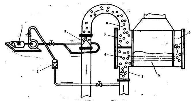 1一膠球泵2—裝球室3—冷卻水進口4—膠球室5—換熱管·6—凝汽器后水室7—凝汽器前水室8—冷卻水出口9一收球網