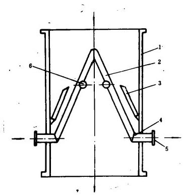 圖3為活動柵格式倒“V”型收球網,它位于凝汽器冷卻水的出口管道上。當不清洗時,兩活動收球網與冷卻水流動方向平行;當清洗系統運行時,兩活動收球網與殼體筒壁貼合,將投入清洗的膠球從冷卻水中收集到兩側的收球口,進入清洗系統管道,再通過膠球循環泵使膠球在清洗系統中循環工作,而冷卻水則通過收球網上的柵空流向出口。因優化后的活動收球網可以反向轉動一定角度,故可對柵網上的貼掛物進行反沖洗。