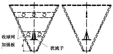 (3)經過與廠家協商,為克服循環水出口壓力偏高造成的膠球在收球網內的強烈旋轉,如圖2所示,在膠球清洗裝置內部加裝擾流子,要求擾流子材質為Q235,擾流子和收球網加強板要可靠地焊接。以降低凝汽器循環水出口的壓力及膠球在收球網內部的旋轉強度,從而使膠球順利地落入收球網底部,及時送入收球泵入口管道。