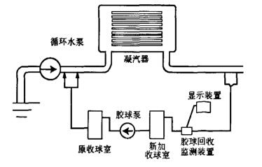 在火力發電廠發電機組正常運行過程中,由于水質及溫度等原因凝汽器管內壁會結出不同程度的污垢,影響凝汽器換熱,造成機組真空降低,增加發電煤耗。目前,大多數電廠對凝汽器的結垢主要是采用周期性膠球清洗的辦法進行處理,即膠球清洗。凝汽器周期性膠球清洗裝置是由收球網、膠球輸送泵、裝球室、控制器、膠球及閥門管路等部件組成的(如圖1所示)。它借助高壓水流的作用將大于凝汽器冷卻管內徑的清潔膠球擠過冷卻水管,對冷卻水管進行反復擦洗,清洗凝汽器冷卻水管內污垢并帶出雜質。從而可以實現保證凝汽器管內壁清潔,延長冷卻管使用壽命、保證汽輪機真空、提高發電廠經濟效益、保障機組安全運行等目的。而凝汽器膠球清洗裝置系統清潔效果能否達到佳,依賴于膠球個數是否足量?偸谴嬖谶@樣那樣的原因導致清洗過程中膠球的堵塞,出現丟球現象,這都直接影響了清洗程度及換熱效果。