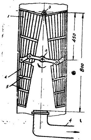 關(guān)于開關(guān)膠球清洗裝置也有二種方案,一種是現(xiàn)采用的,優(yōu)點是開關(guān)方便一些;缺點是杠桿系統(tǒng)和旋轉(zhuǎn)軸都“貫穿”循環(huán)水管,增大了水阻,即使處于“短路”狀態(tài)此水阻仍去不掉。另一種利用類似于潤門開關(guān),在收球網(wǎng)之外開和關(guān),(圖3乙)它在“短路”狀態(tài)時,開啟機構(gòu)已旋出循環(huán)水管外,可減少短路時的水阻,當(dāng)然機構(gòu)稍復(fù)雜一點,開關(guān)稍費事。我們擬在”3機采用這種機構(gòu),以和“4機對比。