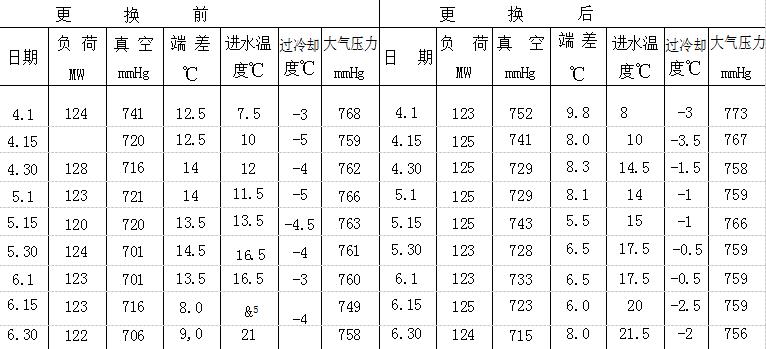 2、每臺機(jī)每兩天進(jìn)行一次膠球清洗,每次投入300個膠球,清洗1小時,收球半小時。經(jīng)過兩年的實踐,證明14FH-5-0凈水器和S-14-0收球網(wǎng)操作方便、除污性強(qiáng)、耐海水腐蝕、收球率在95%以上、對凝汽器冷卻管保護(hù)膜沒有損壞、減輕了檢修人員的勞動。凝汽器各項經(jīng)濟(jì)指標(biāo)大有好轉(zhuǎn),經(jīng)濟(jì)效益顯著提高。以1號機(jī)為例,更換前、后每月抽出三天,以每天上午9點鐘的運(yùn)行參數(shù)進(jìn)行同期比較,見附表.