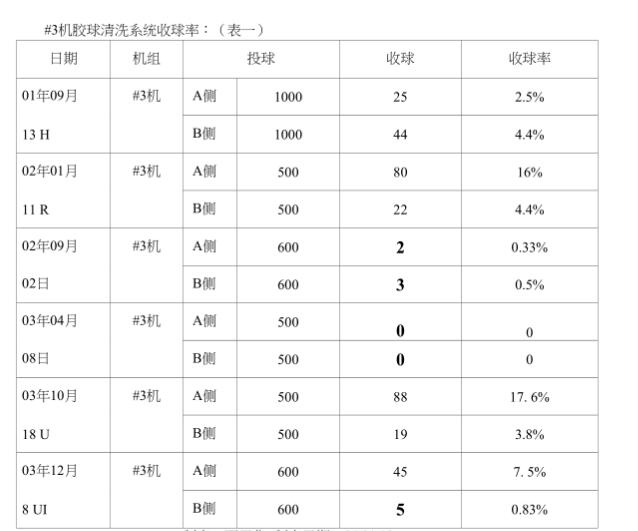 從表中可以看出,#3機膠球清洗裝置系統收球率確實很低(平均收球率4.8%)。